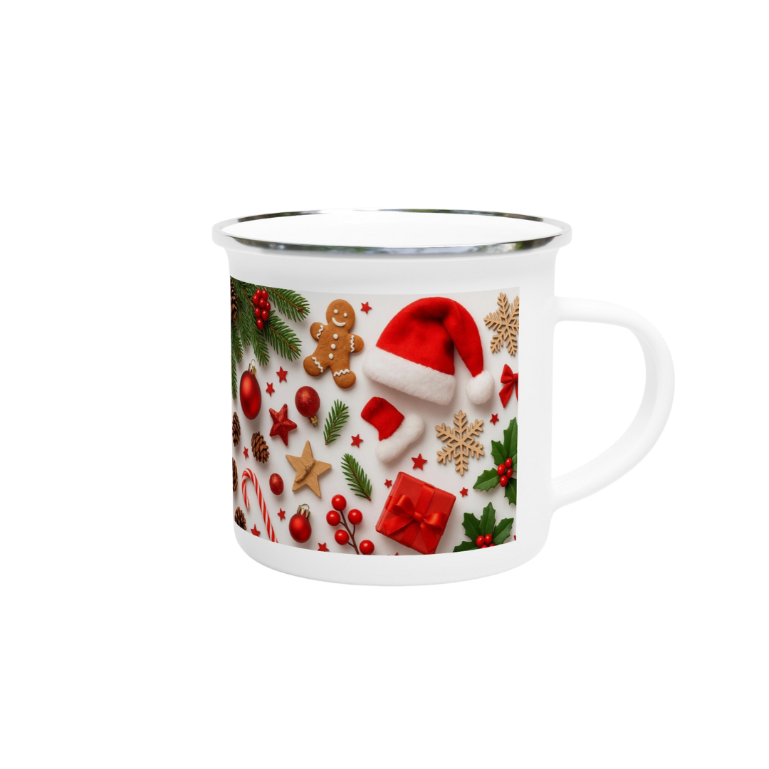Festglans är en lätt och hållbar julmugg som rymmer 350 ml, dekorerad med en färgstark design som för tankarna direkt till julens glädje. Motivet bjuder på tomteluva, pepparkakor, julgran, röda paket och grankvistar – allt inramat av den vita ytan och en elegant silverkant. Resultatet är en mugg som sprider värme och feststämning vid varje klunk.