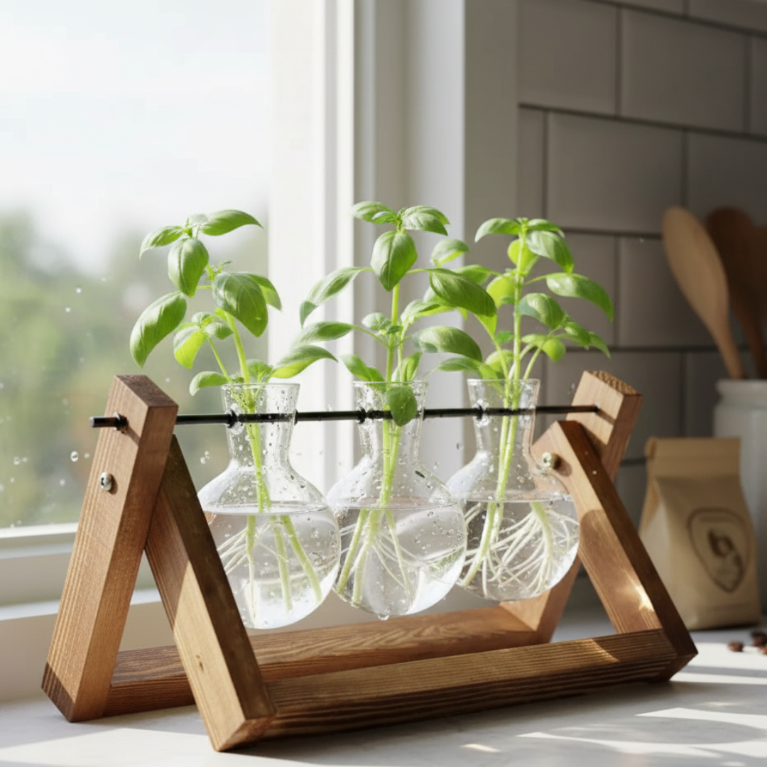 Hydroponisk odling låter dig odla direkt i vatten – utan jord, smuts eller krångel. Det är både vackert och praktiskt, samtidigt som du får en tydlig vy över växternas utveckling.