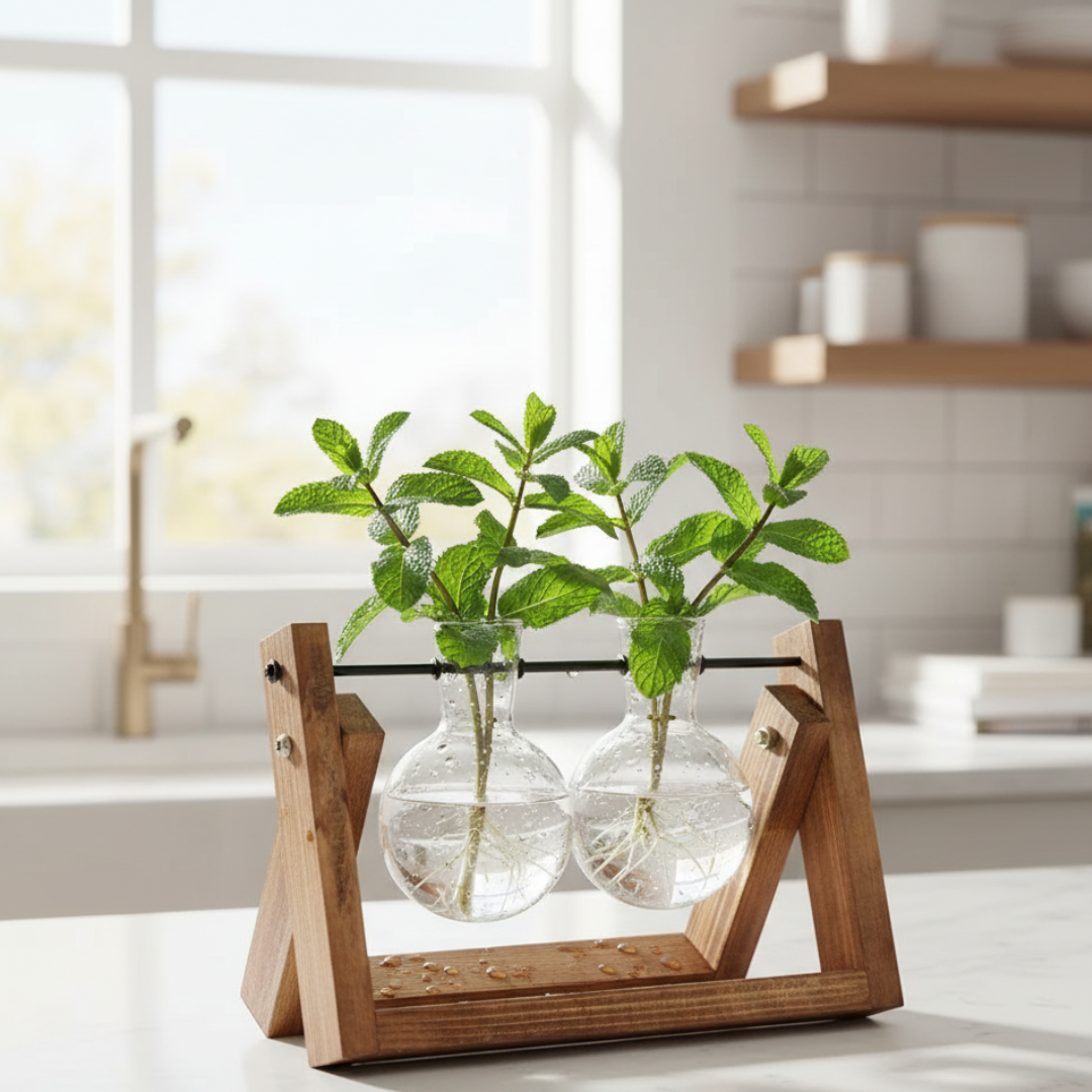 En stilren liten glasvas med träställning som låter dig odla, dekorera och skapa en levande känsla i hemmet. Perfekt för sticklingar, färska blommor och hydroponisk odling – vacker på skrivbordet, i köket eller i vardagsrummet. Finns i tre varianter: med en, två eller tre glasvaser.